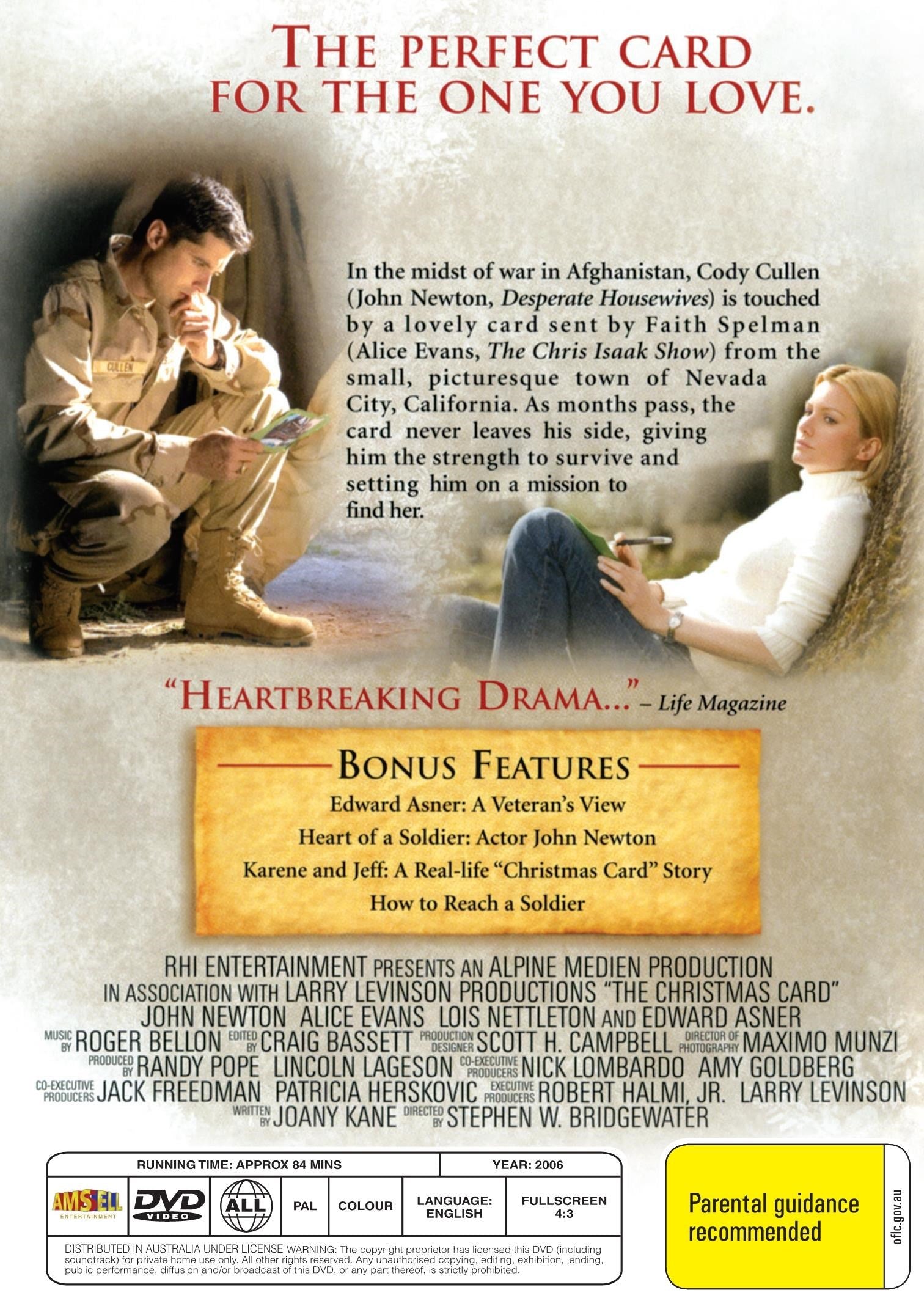 US Army sergeant Cody Cullen's horror tour in Afghanistan ends when his fellow soldier Jonesy is killed in an attack while they are delivering medical supplies in Nurestan. Cody is put on leave and goes to return private possessions to Jonesy's bride turned widow. On his way home he passes Nevada City, California, where he meets Faith Spelman, who writes the parish's Christmas cards to lonely soldiers, who had coincidentally included him, an orphan. He happens to save her dad Luke from a serious car run-over. The Spellmans invite Cody home for dinner, then the Christmas tide. He proves a great help in the family logging firm. Vietenam vet Luke wants Cody as son-in-law, but although charmed, Faith still seems committed to rarely present fiancé Paul, a wine broker.